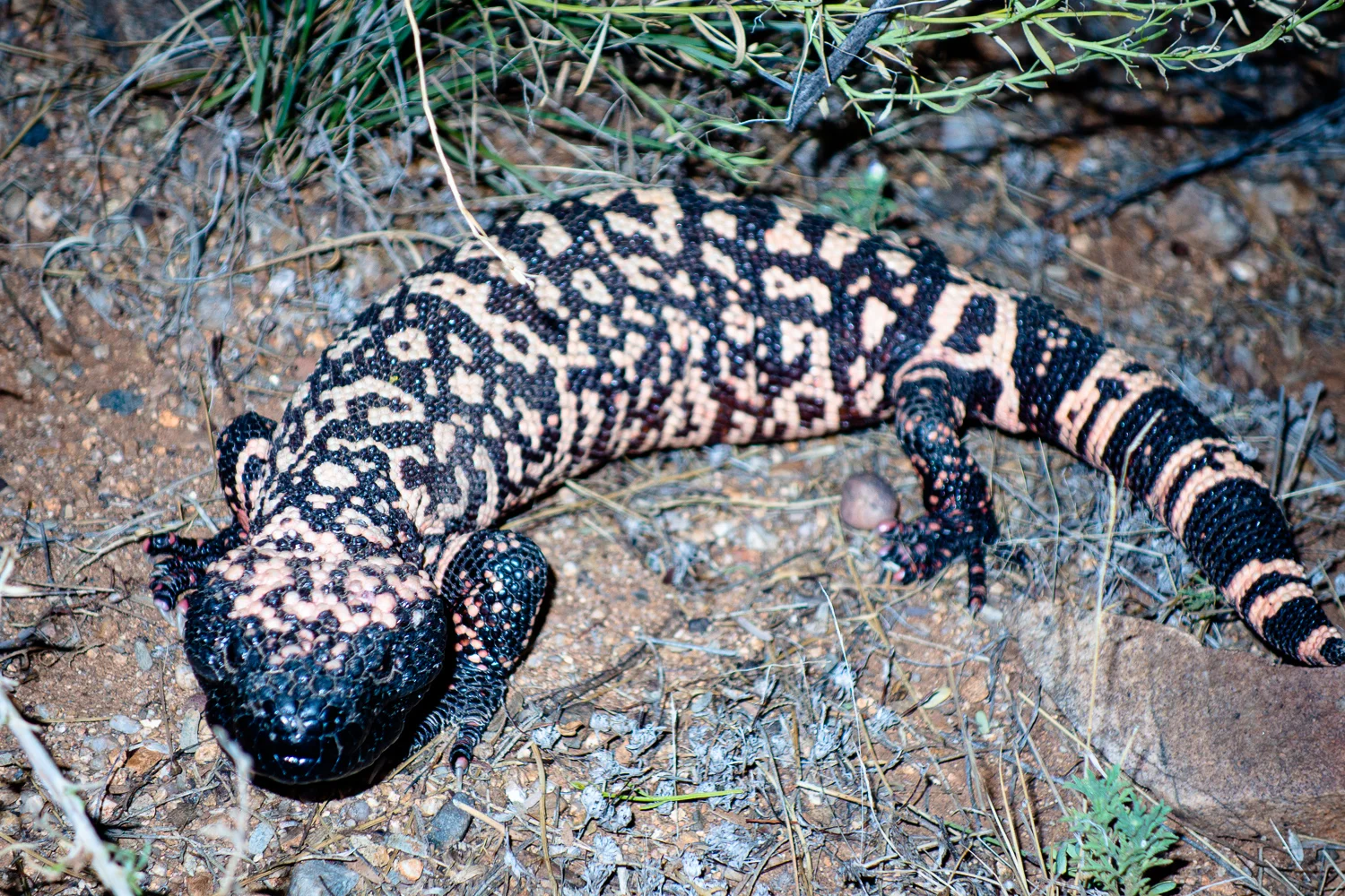 First time I have seen a Gila Monster with yellow (ish) coloration. The color scheme for the newly born monsters. Their coloring will evolve to a pink or orange with black pattern.