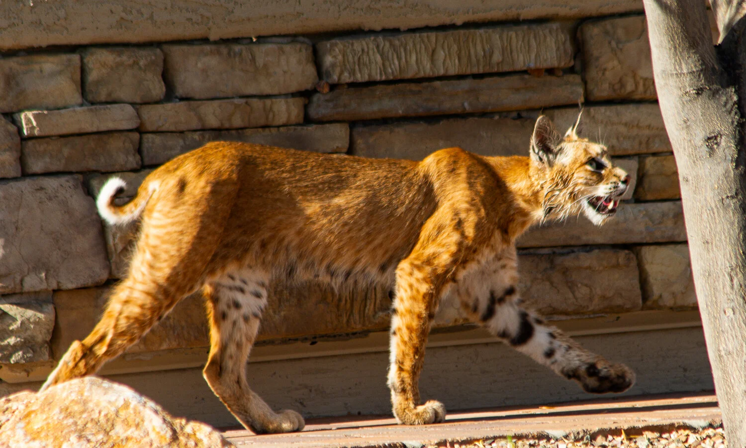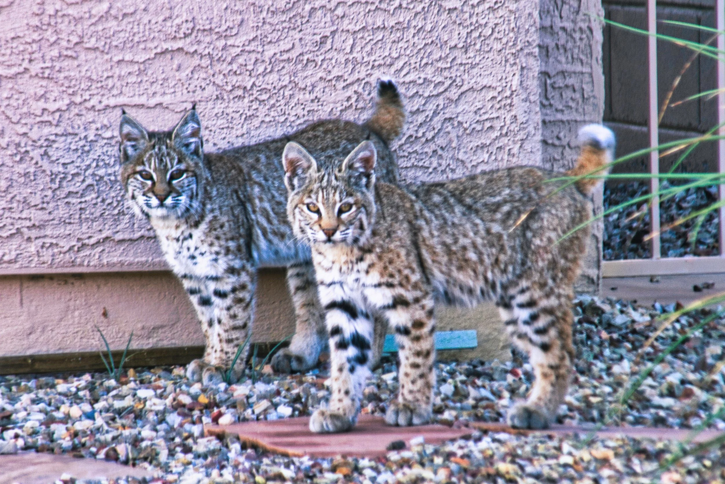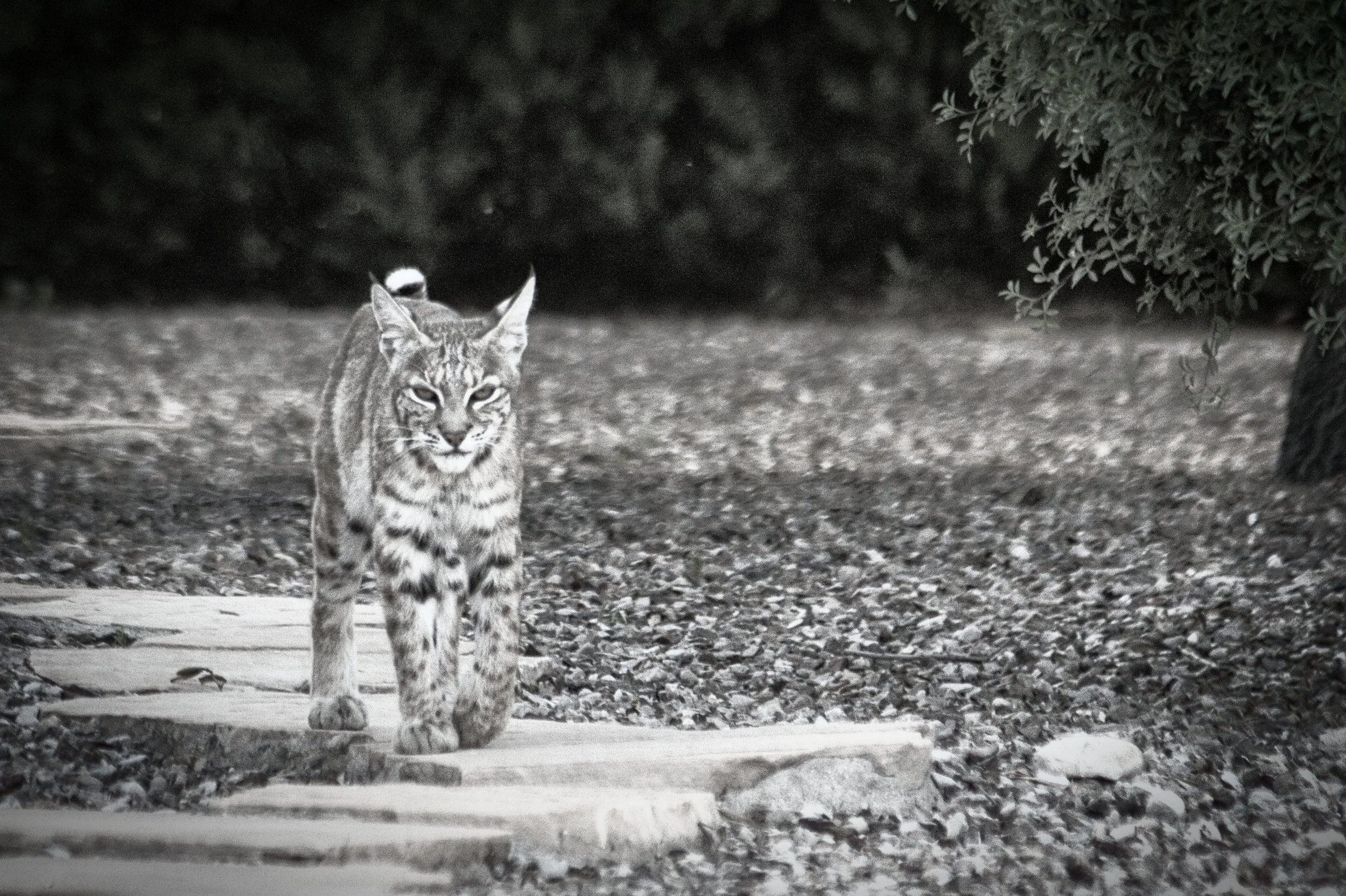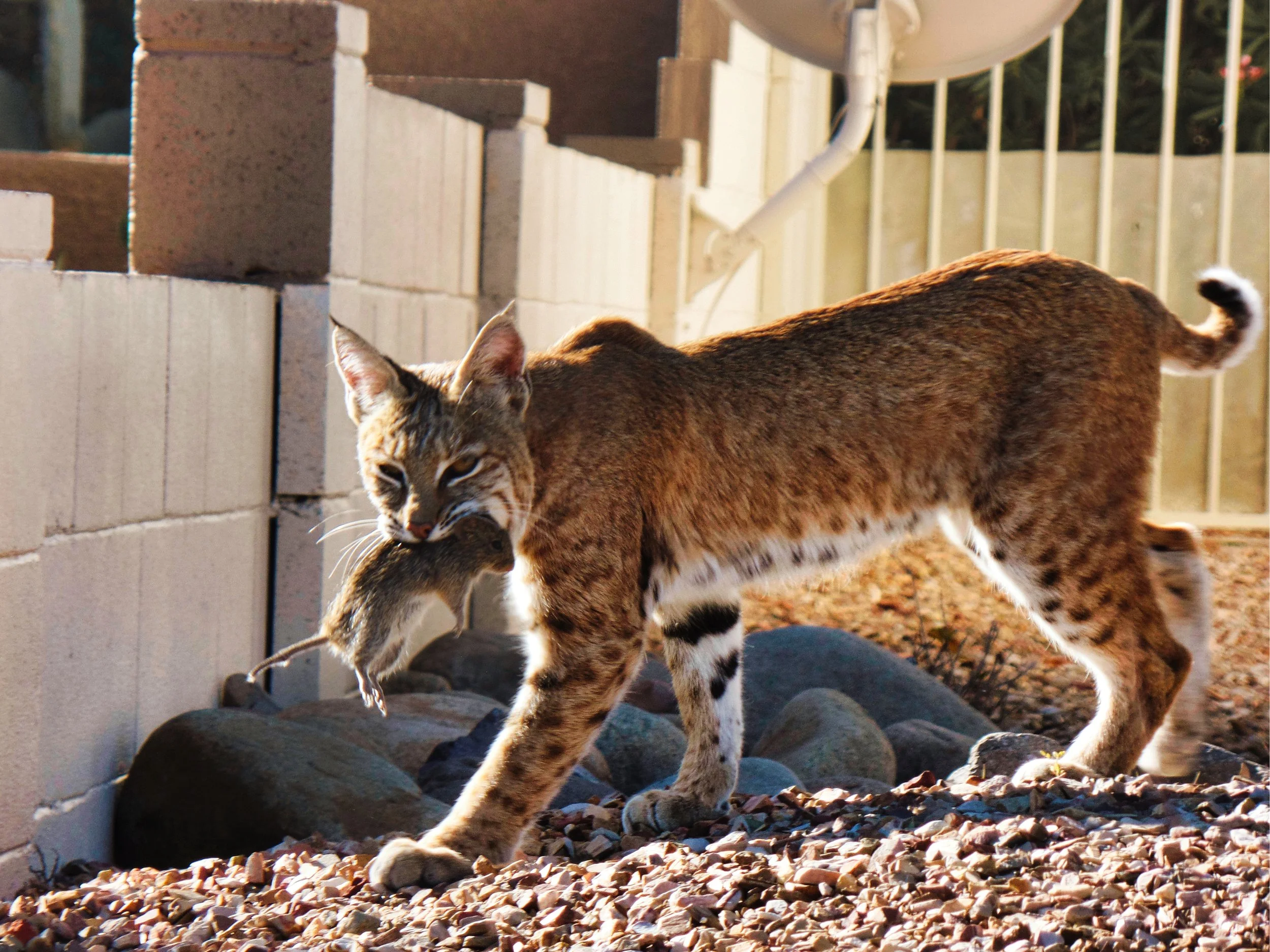 I first caught sight of this bobcat as he strolled through our front yard. A quick camera retrieval and I was out the door to seek and locate him/her a couple houses away. Our photo session would take us across a few more homes until I hit the video record button. The largest dog in the neighborhood would break up our time together. I would see the bobcat, one more time, an hour later, while on my hike. He was balanced on a narrow wall in the next neighborhood, watching.