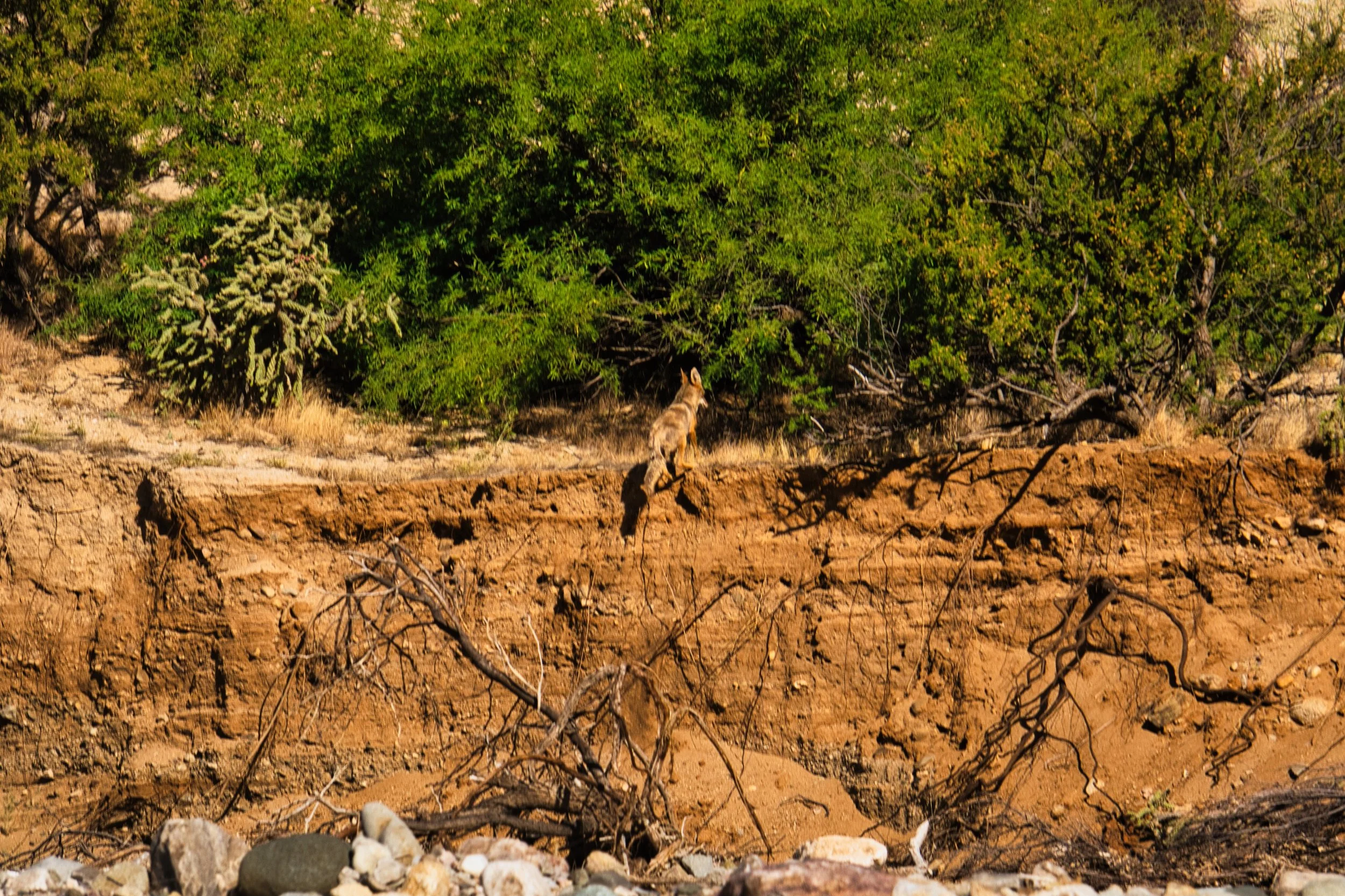I was not expecting to see much on the hike today, but my eyes were deeply scanning the terrain. I did witness a coyote run up the side of the wash. Impressive, but I had missed the critical moment with a photo at the top, the coyote looking in my direction. A minute later, a second coyote ran across the wash, and I was barely prepared as I needed to find the coyote in the frame quickly. With a quick click, I got him just going over the edge.