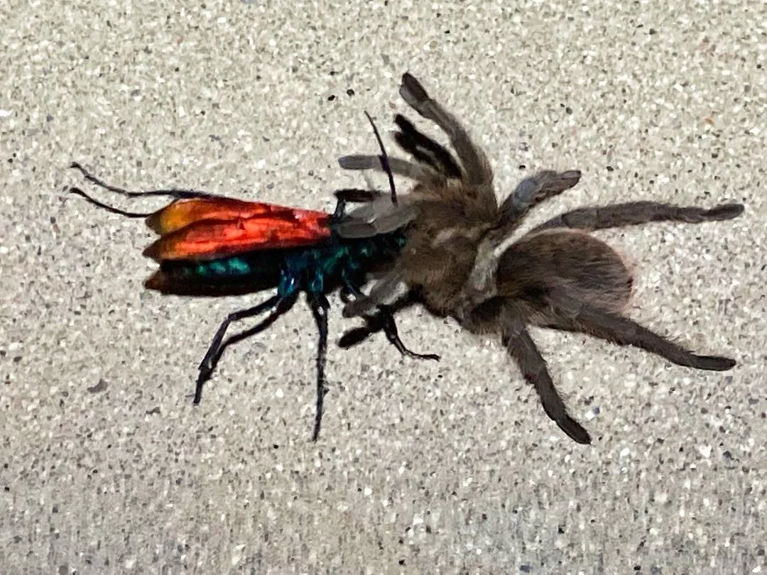 Tarantula Hawk with a Tarantula. Go to my ‘Stories behind the images’ section for a story of what is happening in this photo. It is the most unusual story I have heard that the desert offers.